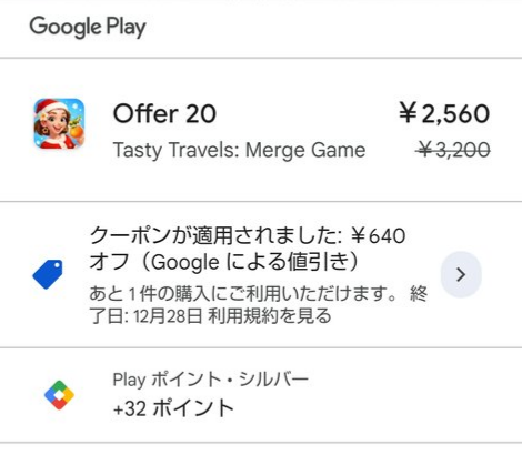 たまたまクーポンが発行されていたようです。3,200円の課金時に、GooglePlayのクーポンが適用され、3,200円→2,560円に640円の割引が入りました。