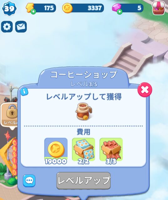 レベルアップに、建築ツールと19,000コインが必要になります。