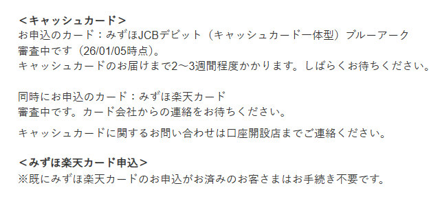 クレジットカードについては銀行口座と同時に申し込む形になっているようで、「審査中」となっていました。