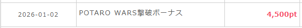 ポイントは付いたので問題なし。あとはPOTARO WARSの撃破ボーナスが1月末に付与されれば終わりですね。