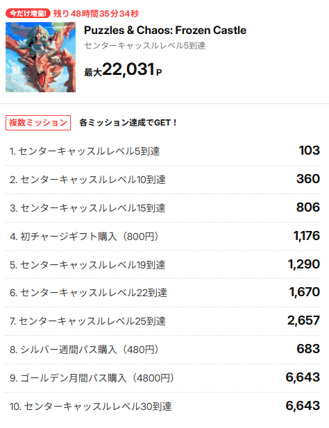 ポイントサイトの案件「パズル&カオス」のキャッスルセンターレベル25を23日目に達成できました。