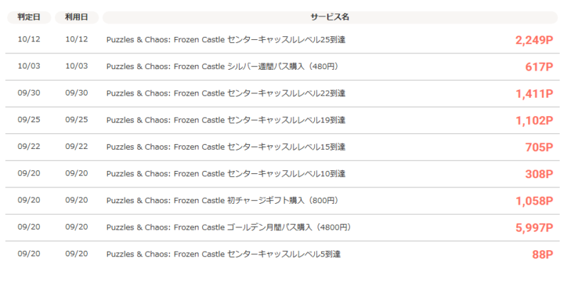 上画像は私のモッピーの通帳です。9月20日0時開始でゴールデン月間パスに4,800円課金、朝9時を過ぎてから初チャージギフト800円を購入しています。